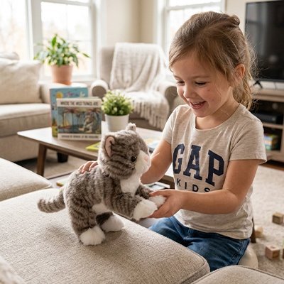Notre gamme s'étend bien au-delà de la forêt. Les lapins aux longues oreilles sont très demandés pour leur facilité de préhension, à l'image de notre célèbre lapin adapté dès la naissance. Les amoureux des animaux de compagnie trouveront aussi une présence apaisante avec notre magnifique chaton au design réaliste.